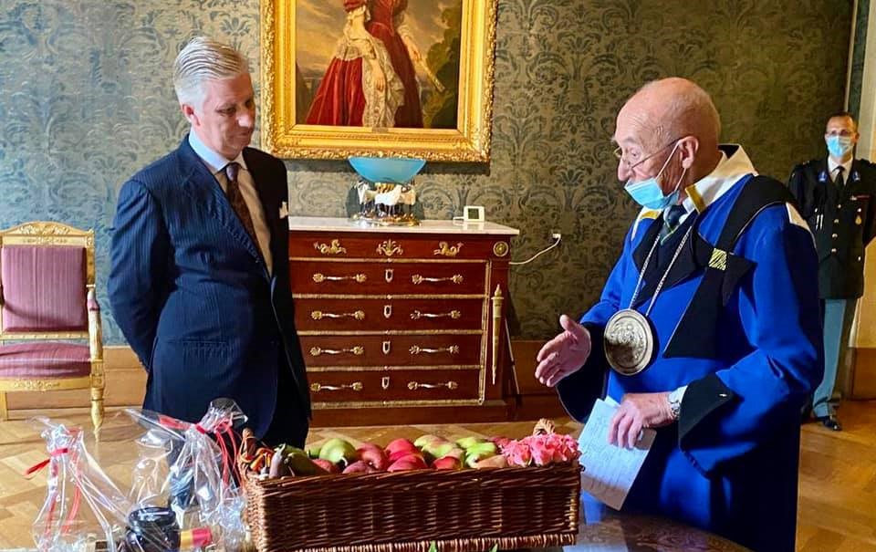 Koning en Koningin ontvangen Commanderie 18/10/2021 De Commanderie van de Edele Haspengouwse Fruyteniers brachten voor de 35ste keer een korf met een diversiteit aan Haspengouws fruit naar Koninklijk Paleis. Deze keer werden ze ook echt ontvangen door Koning Filip & Koningin Mathilde. Een hele eer. © Foto FB Hilde Vautmans