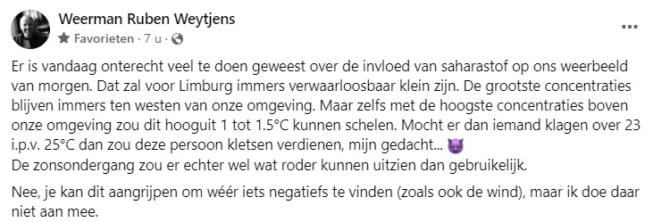 Weerman Ruben Weytjens vindt vindt de heisa over het saharastof en de invloed op ons weerbeeld overroepen. Voor Limburg zal er trouwens nauwelijks sprake van zijn.