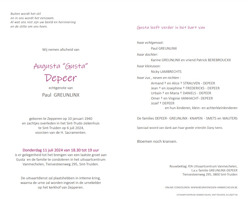 Wij vernemen het overlijden van Gusta Depeer. Bij deze betuigen wij de familie onze innige deelneming en wensen we allen veel sterkte toe.