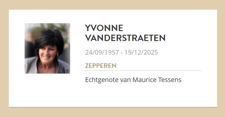 Wij vernemen het overlijden van Yvonne Vanderstraeten. Team Truineer betuigt familie, vrienden en kennissen zijn innige deelneming en wenst allen veel sterkte toe.